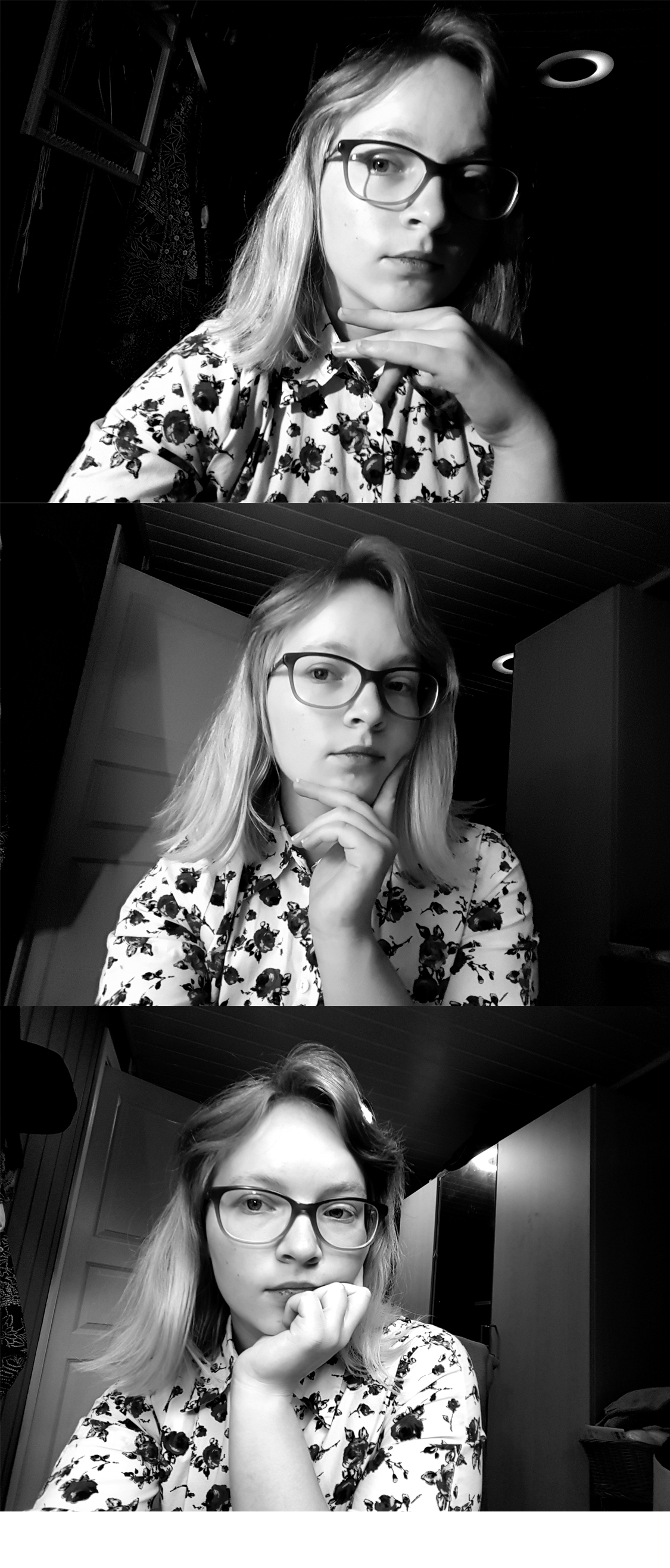 From the top down the lighting goes from hard to soft. At the top I assisted by my trusty reading lamp. In the middle I added the light from the floor lamp with it’s lampshade aka it’s softbox. And bottom picture is daylight, lamp and sealing light. I choose to present it in black and white to bring out contrast.